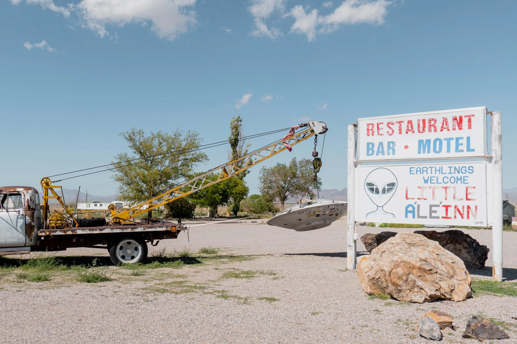 The Extraterrestrial Highway runs 148 miles through southern Nevada between Crystal Springs and Tonopah, but when I drove it, my journey ended in the tiny town of Rachel. Crystal Springs is about 100 miles north of Las Vegas. The ET Highway is so named because the dirt road that leads to Area 51 is located at about the halfway point between Crystal Springs and Rachel. The communities along this highway have leaned in to the alien lore, and have themed their businesses accordingly.